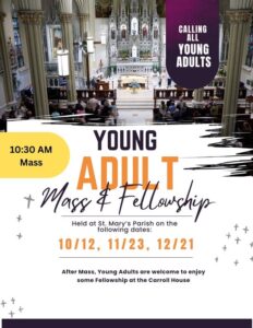 12/21: Young Adult Mass at St Mary’s in Annapolis at 10:30 am, followed by a social in the Carroll House.