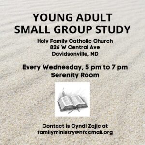 1/7, 1/14, 1/21, 1/28: Young Adult Small Group Study from 5:00-7:00 pm at Holy Family Catholic Church in the Serenity Room. Contact Cyndi for more information.