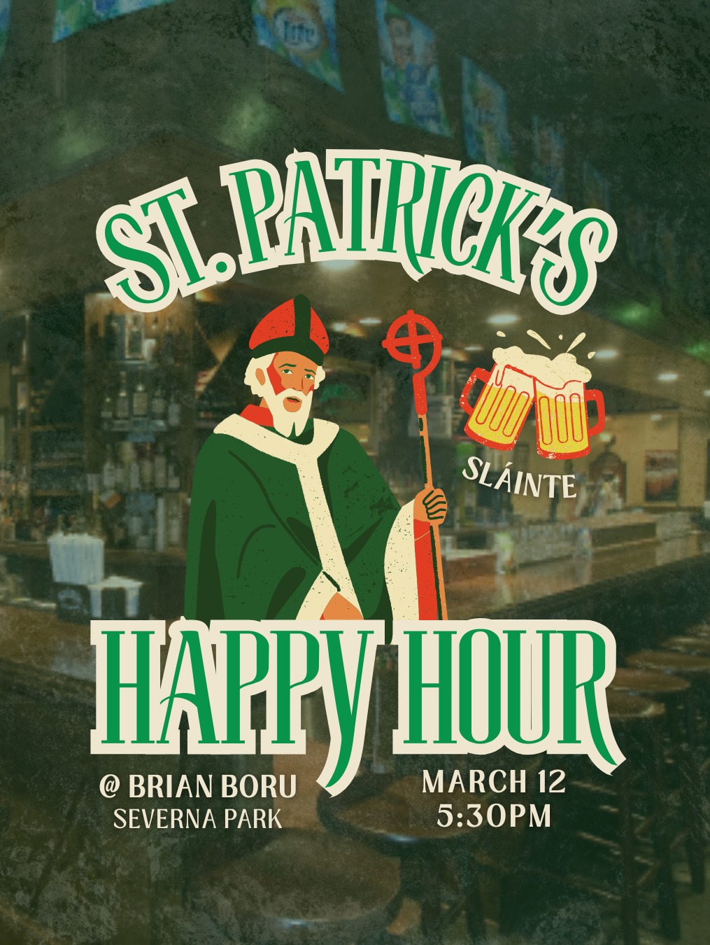 3/12: Join us as we observe St. Patrick’s Day with a 5:30 happy hour at Brian Boru in Severna Park! ☘️